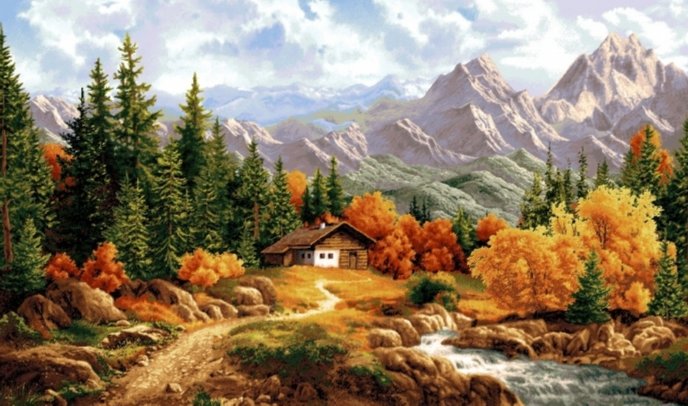 Теги: пейзаж, горы, домик, природа, река.