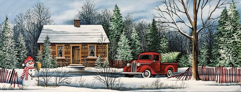 Теги: река, елки, зима.мост, картина, пейзаж, домик, фонари.