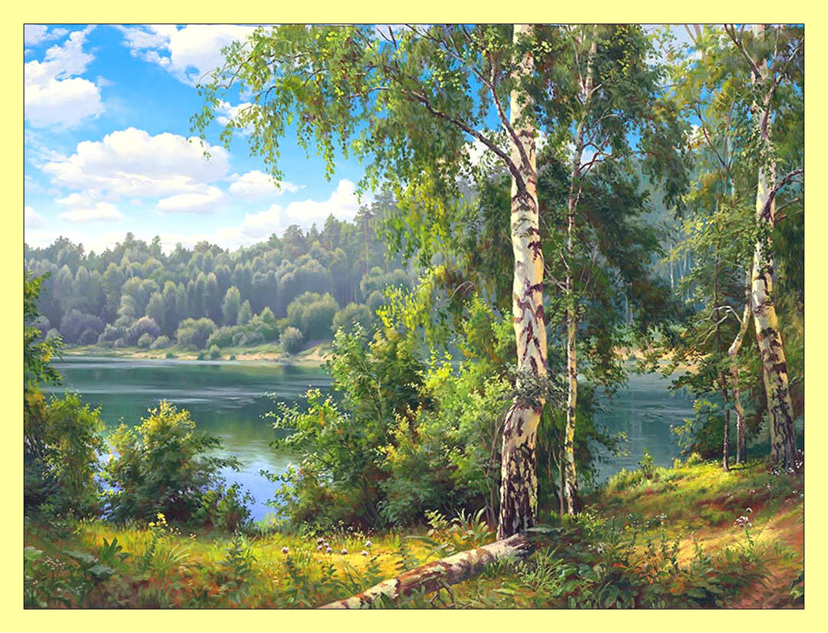 Теги: живопись., березы, лес, озеро, пейзаж.