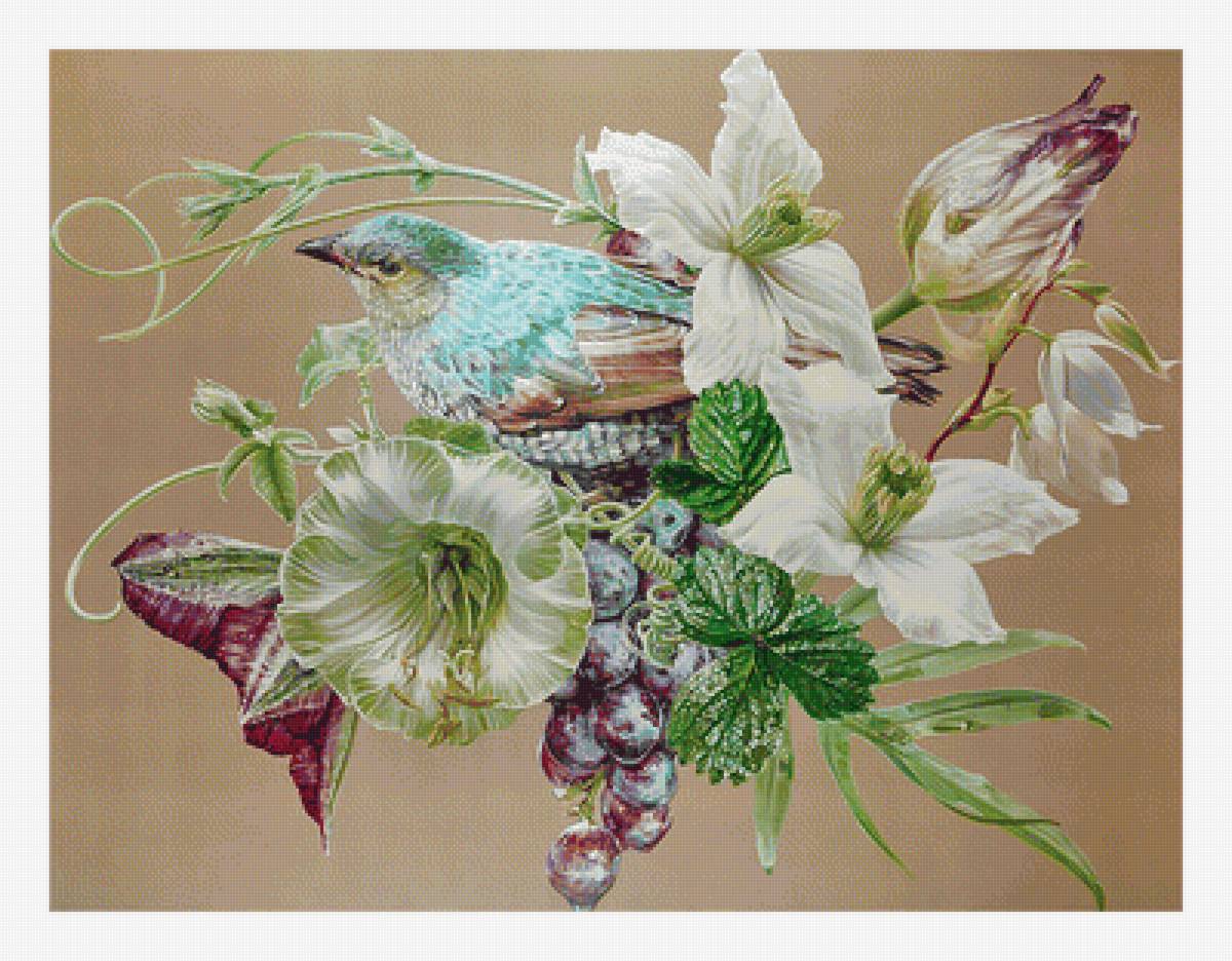 Схемы вышивки, похожие на «Цветочно-ягодная с птичкой.» (№2038374) по сюжету