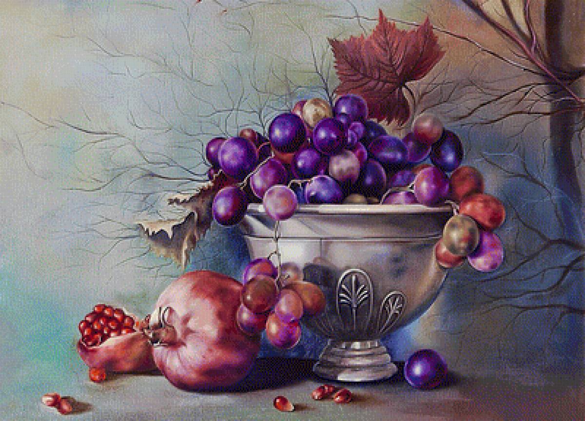 Теги: виноград, фрукты, персики, натюрморт, живопись.