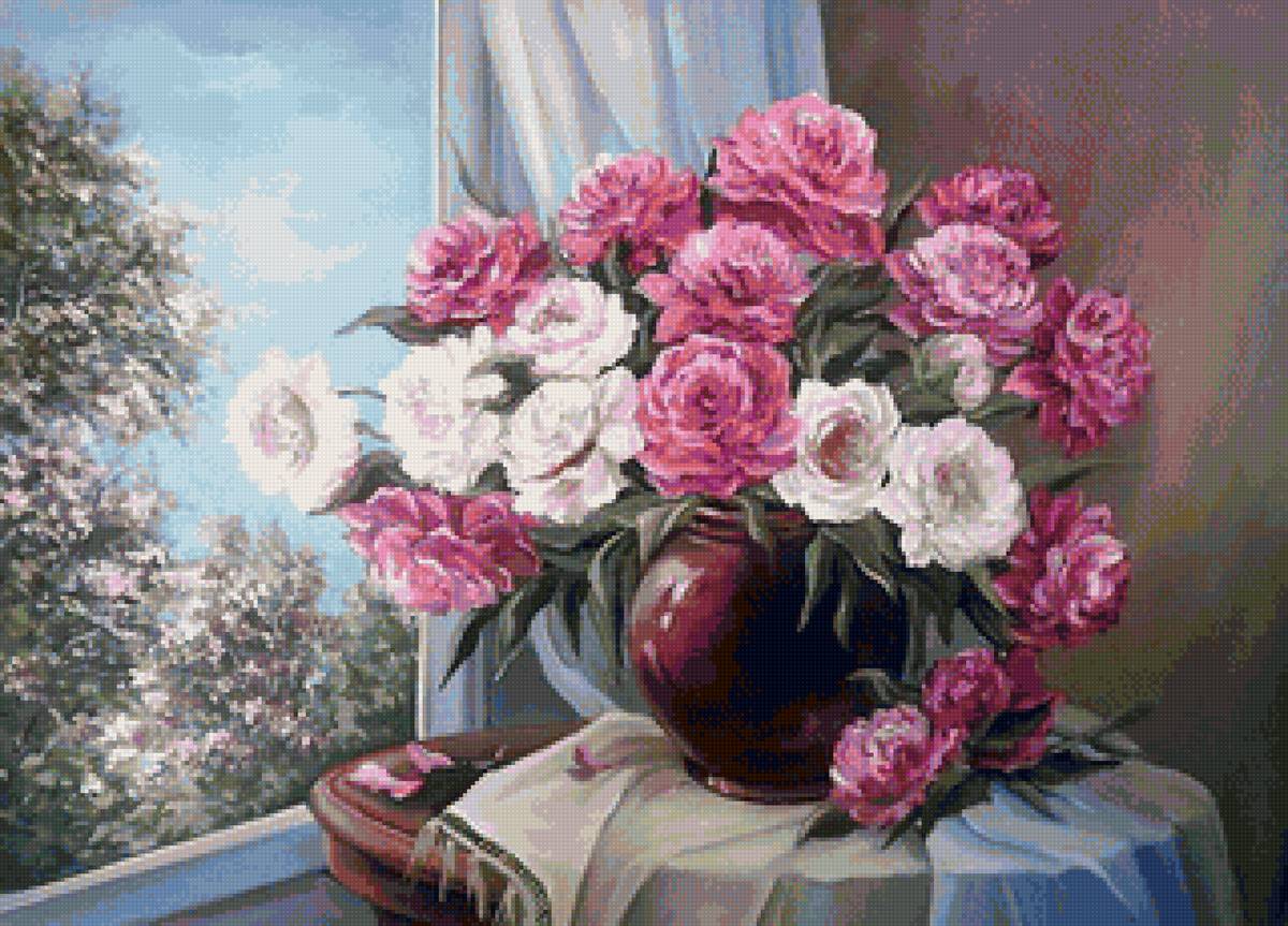 Теги: натюрморт, цветы, лилии, живопись, ваза, окно, букет.