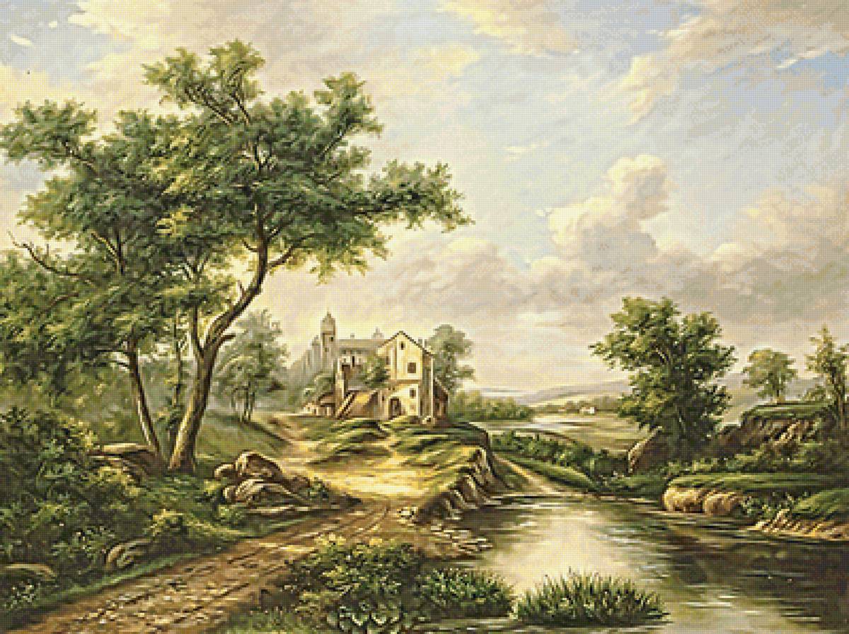 Теги: дорога, домик, пейзаж, река, лес, осень.