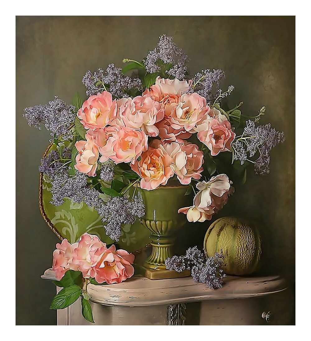 Теги: живопись, цветы, натюрморт, букет, ваза, картина, пчела, кувшин.