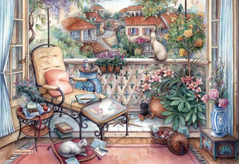 Схемы вышивки, похожие на «КИМ ДЖЕКОБС. УГОЛОК ОТДЫХА НА БАЛКОНЕ» (№2161929) по сюжету