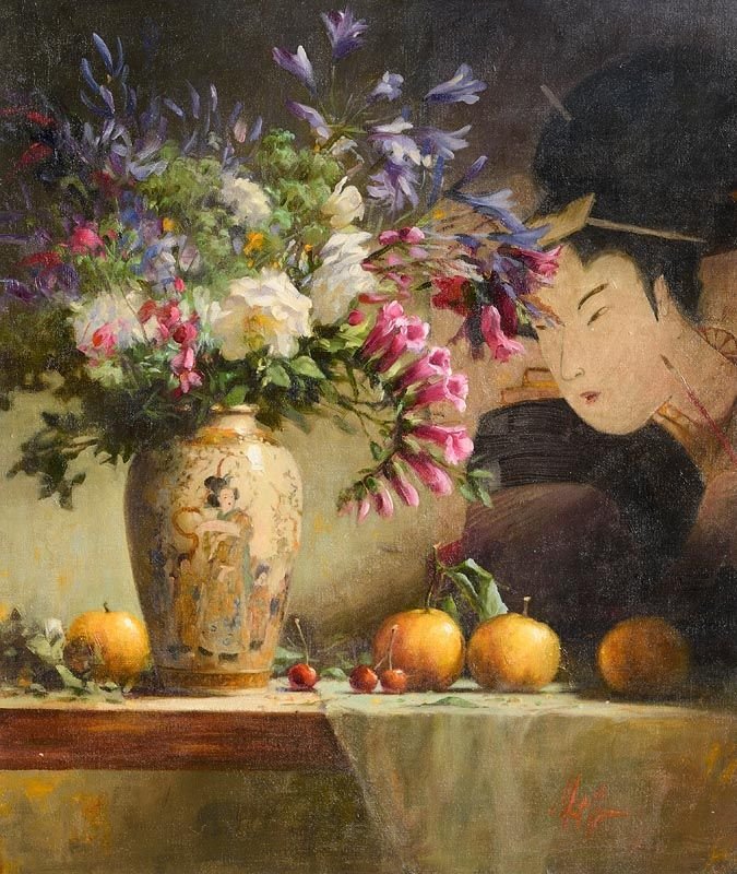 Теги: натюрморт, фрукты, цветы, картина, чаепитие.