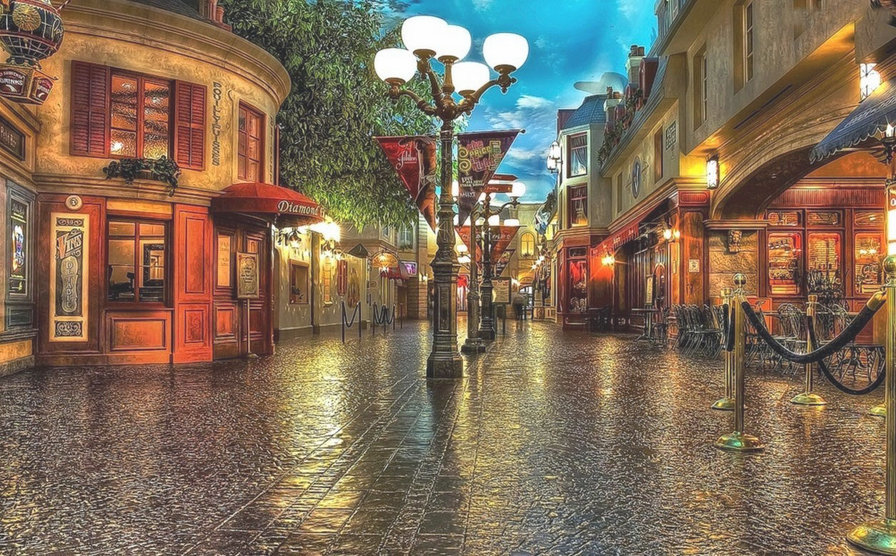 Теги: город, пейзаж, фонари, сумерки, лестница, вечер, дождь.