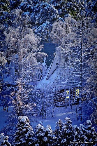 Теги: пейзаж, зимняя картина, домик, ели, природа, зима, лес, иней.
