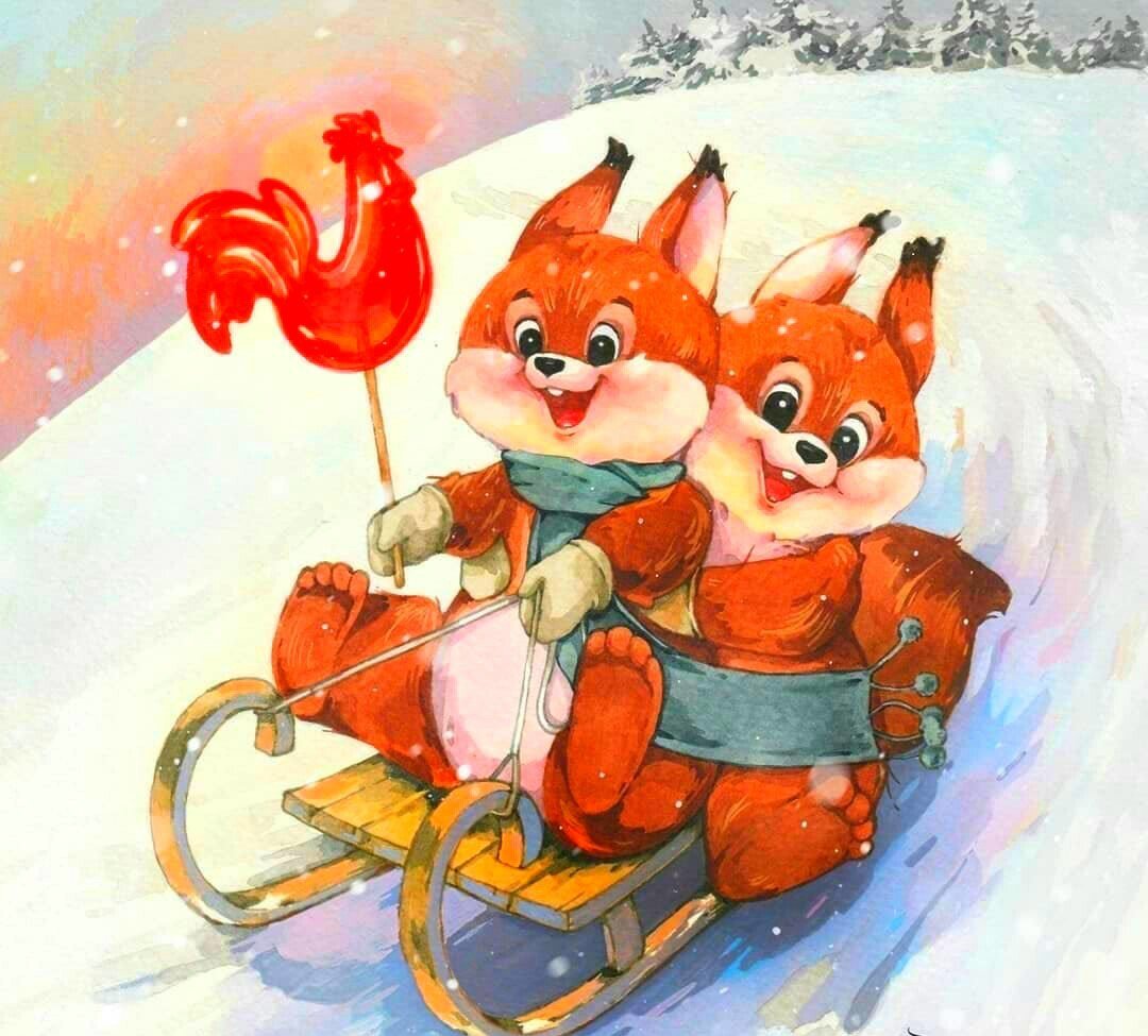 Теги: новый год, девочка, ель, снег, птички. санки.