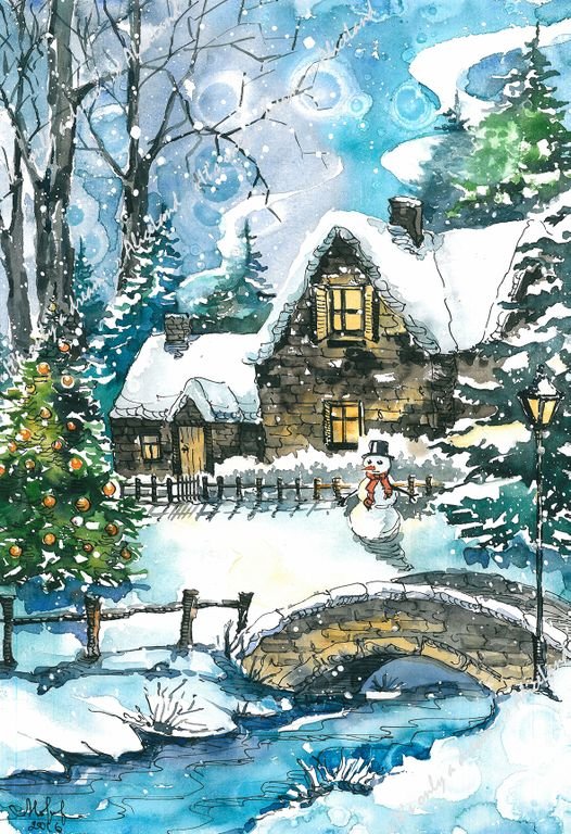 Теги: снеговик, птицы, рисунок, шишки, снег, домик, дом, птички, зима.