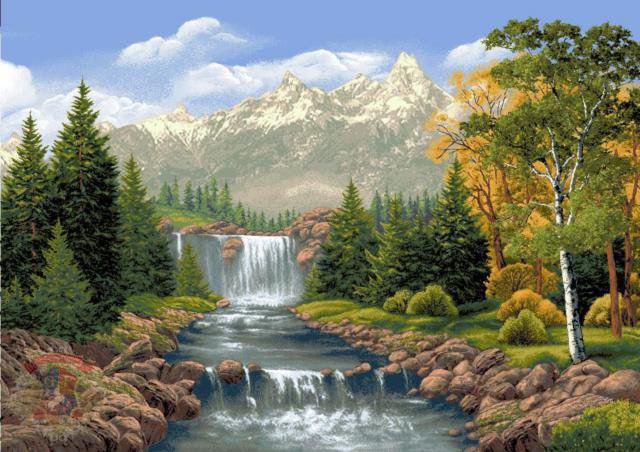 Схема вышивки «Пейзаж, лес, река, горы» (№247253)