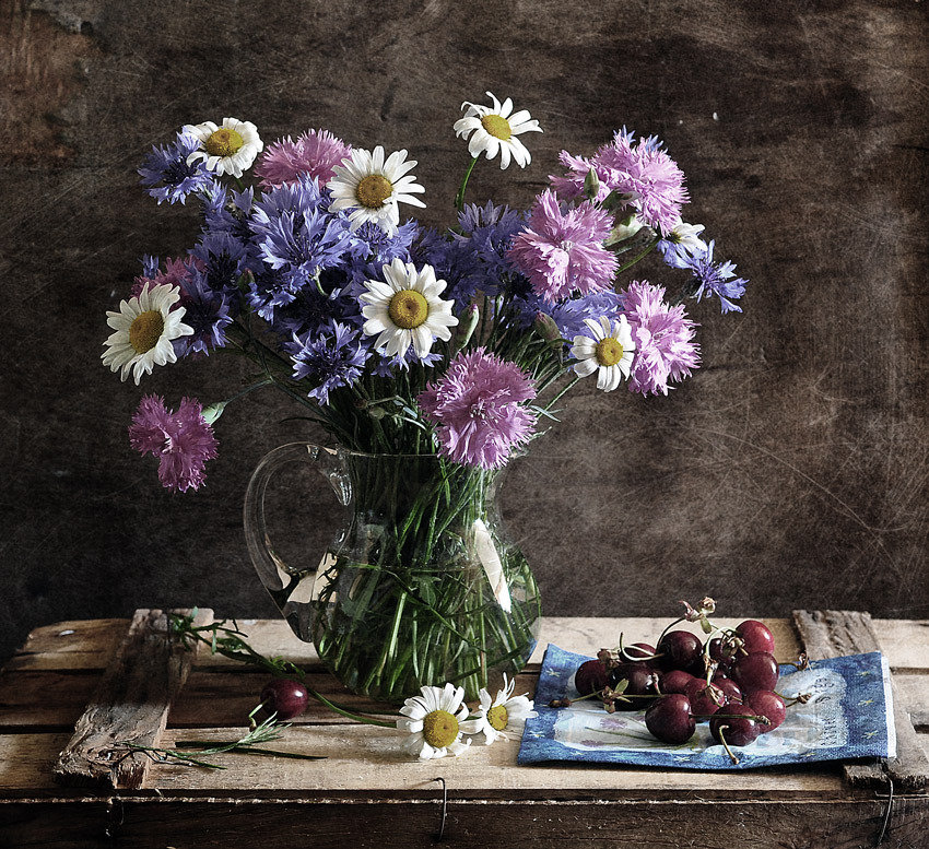 Теги: васильки, букет, бабочка, ромашки.
