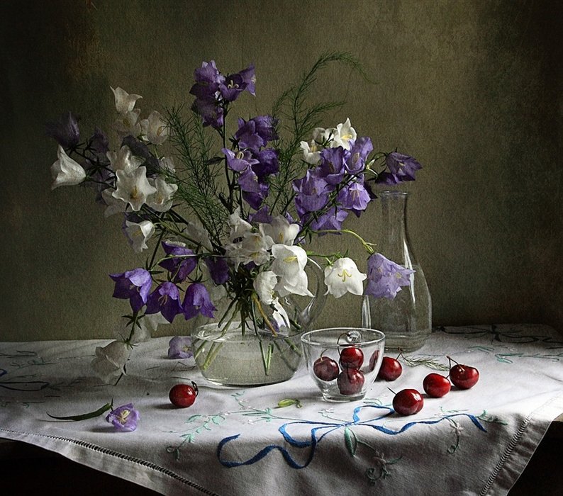 Теги: натюрморт.цветы.букет.фрукты.черешня.ягоды.клубника.