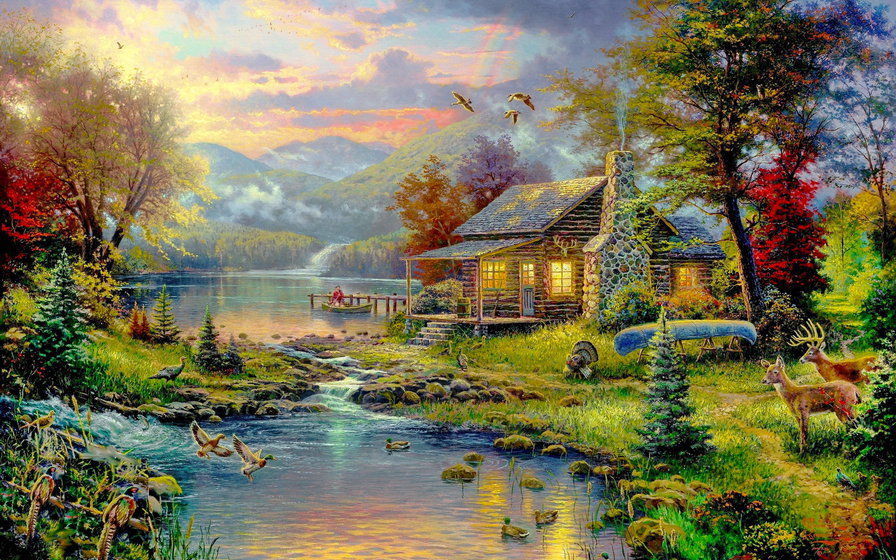 Теги: река, домик, радуга, горы.