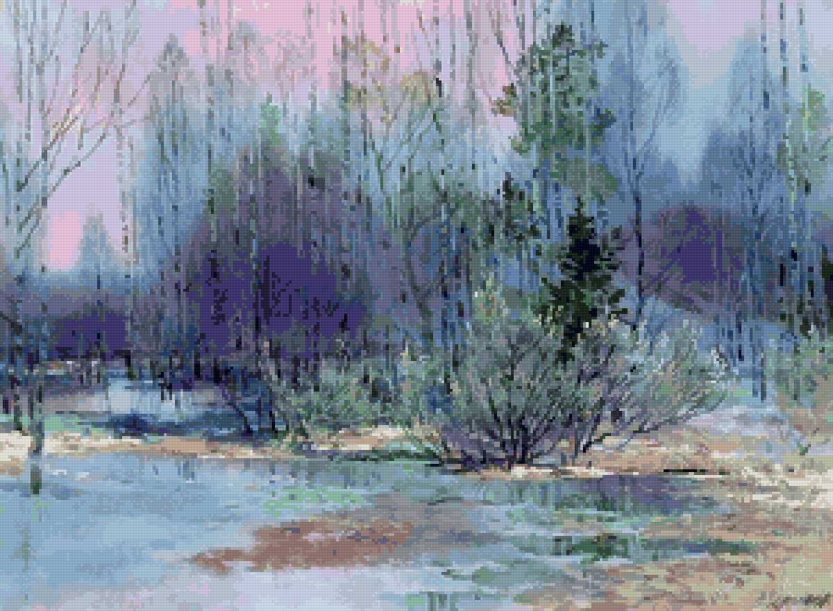 Теги: природа, снег, пейзаж, рассвет, ручей, весна, лес, живопись.