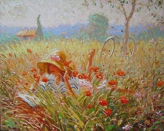 Теги: лето, цветы, подсолнухи, дом, живопись, поле, пейзаж.