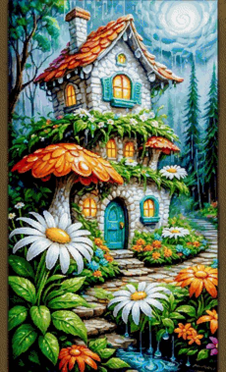 Теги: вышивка крестом, домик, ручная работа, лес, вечер.природа.