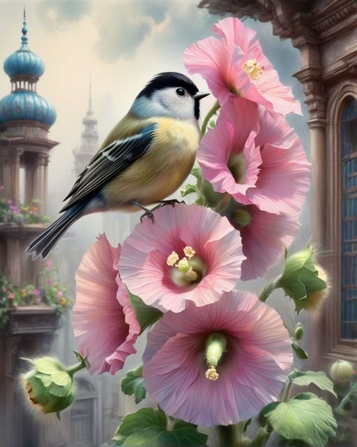 Схема вышивки «Мальвы и птичка» (№2888694)