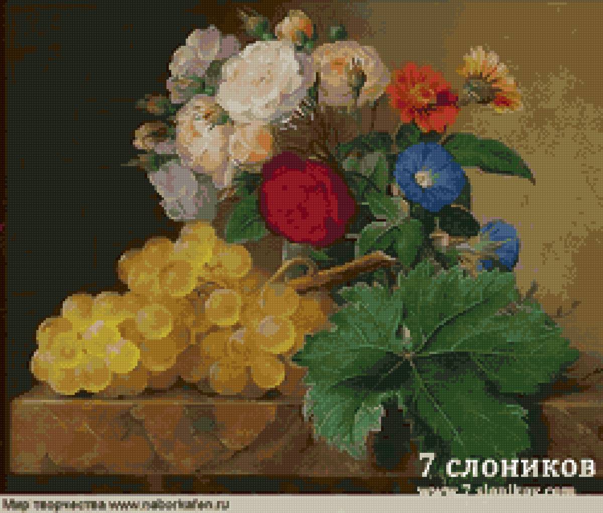 Теги: натюрморт, розы, гра, цветы, фрукты, попугай, виноград, живопись.