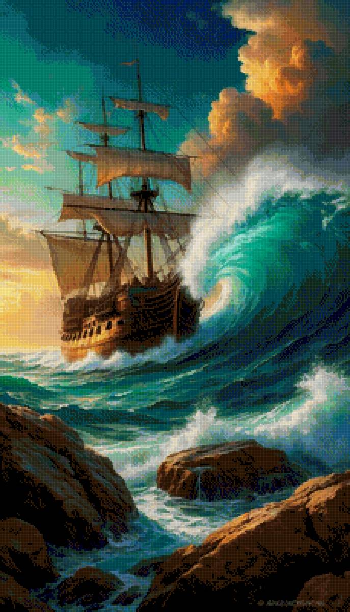 Красиво, романтично, но слишком далеко от реальности: судно не может идти вдоль волны - такая волна, бьющая в борт, непременно перевернёт судно, как бы тяжело оно не было нагружено. ИИ этого, конечно, знать не может, потому и лепит всё подряд