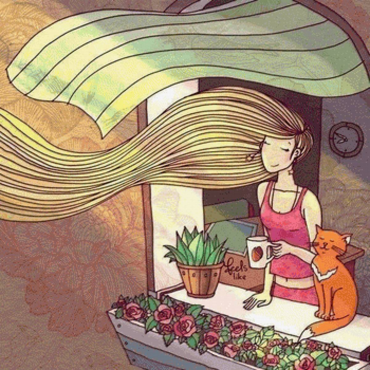 Схема вышивки «девушка и кот» (№2932926)