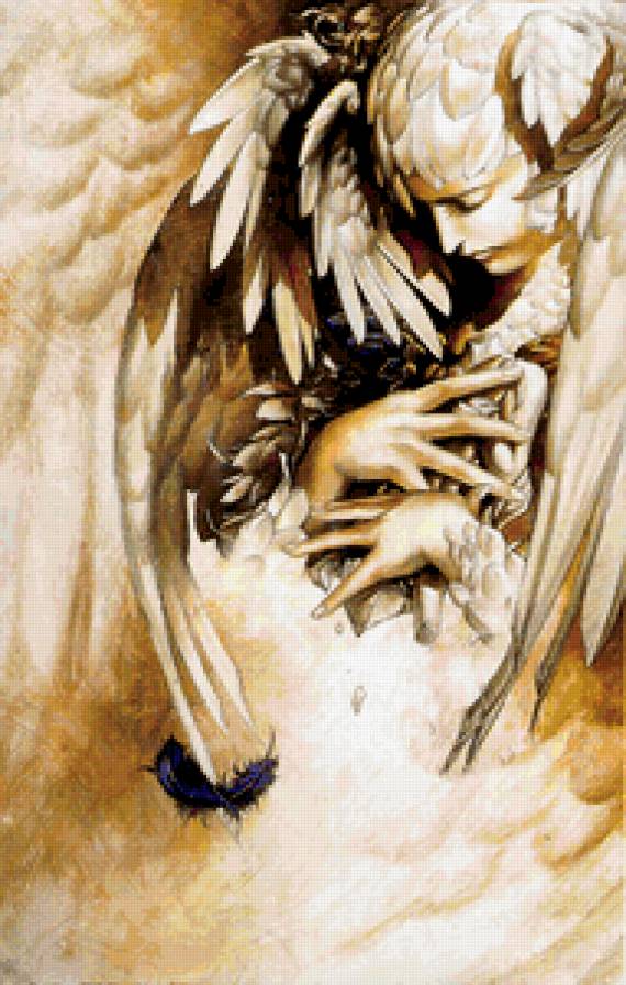 Уважаемые, друзья! Задний фон до контуров крыльев и кистей рук, вышиваем в две нити, а тёмное перо, крылья, голову, осколки от статуэтки и статуэтку в руках, вышиваем в три нити. Канву я бы посоветовал белого цвета. Всем удачи!