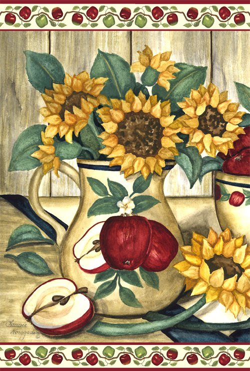 Теги: ваза, подсолнухи, яблоки, натюрморт.