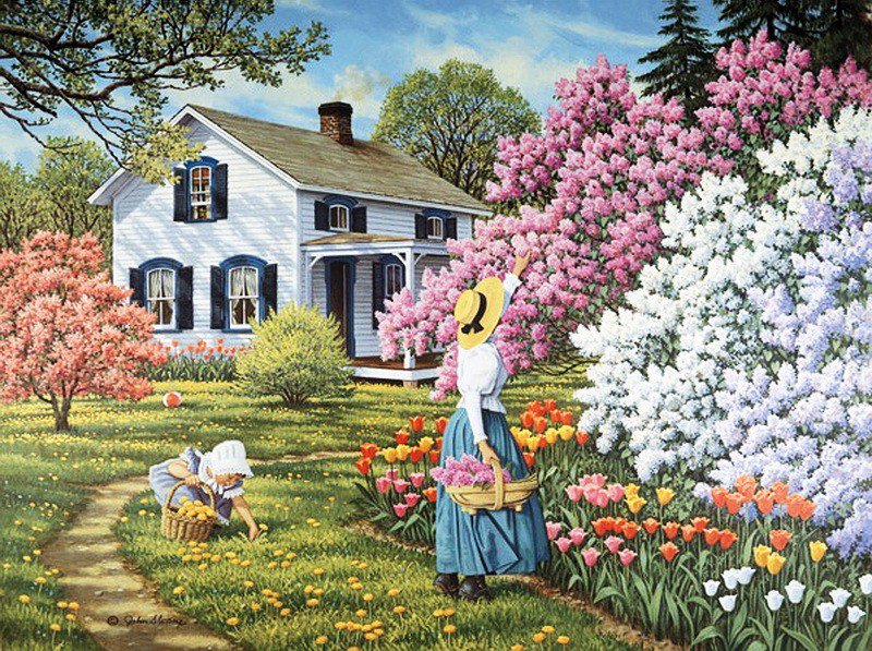 Теги: лето, садик, картина, цветы, природа, домик, пейзаж.