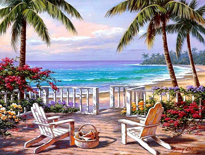 Теги: пейзаж, картина, природа, цветы, экзотика, пальмы, дом, океан, море.