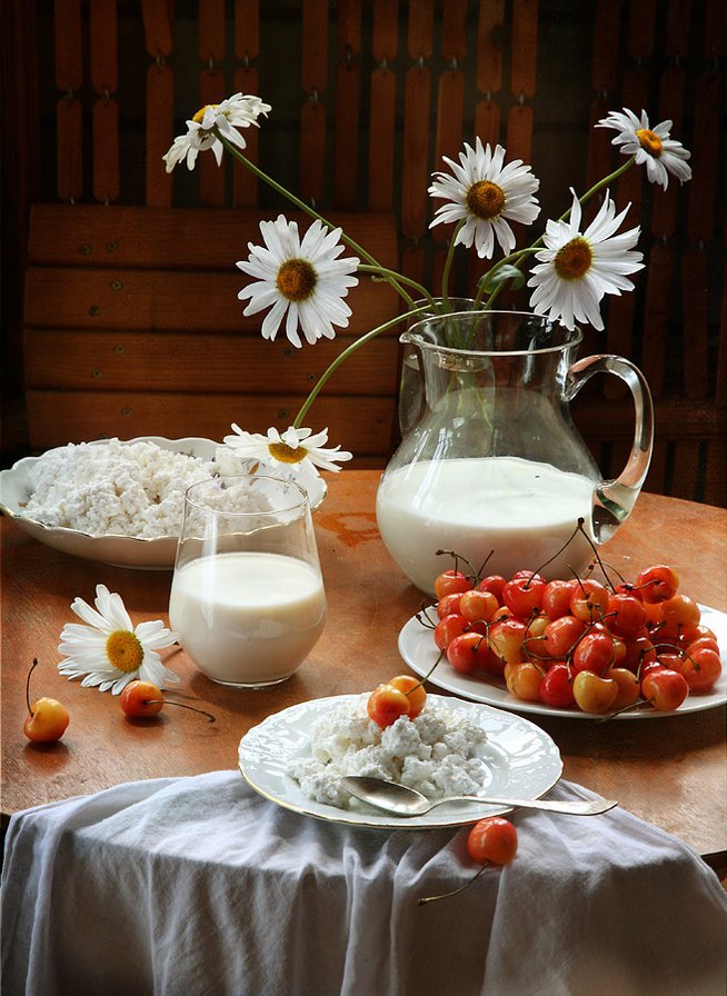 Теги: натюрморт.цветы.букет.фрукты.черешня.ягоды.клубника.
