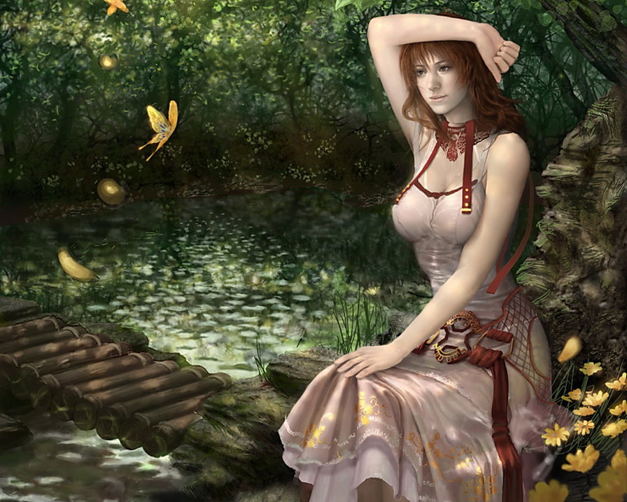Теги: девушка, вода, озеро, лес.