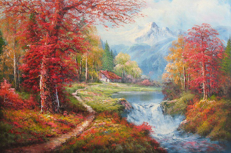 Теги: пейзаж, мост, осень, домик, река.