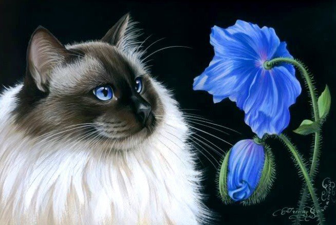 Теги: кошка, животное, пейзаж, кот, картина, цветы.