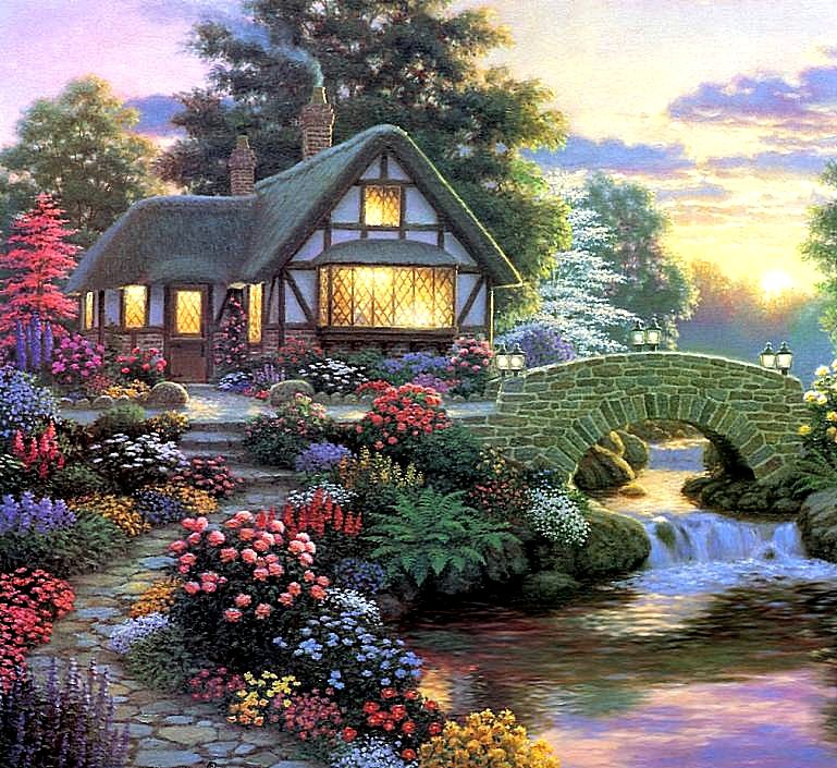 Теги: лето, домик, сад, пейзаж, природа, цветы, искусство.