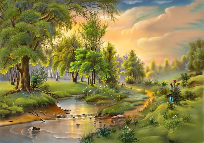 Теги: березовая роща, речка, весна, сосны.