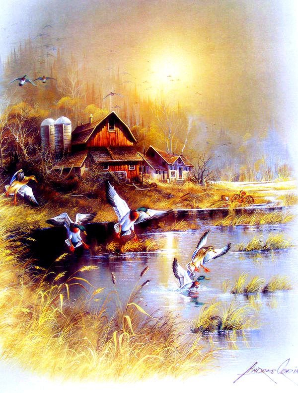 Теги: пейзаж.деревня.дом.зима.закат.река.птицы.утки.