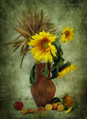 Теги: натюрморт, ваза, яблоки, подсолнухи.