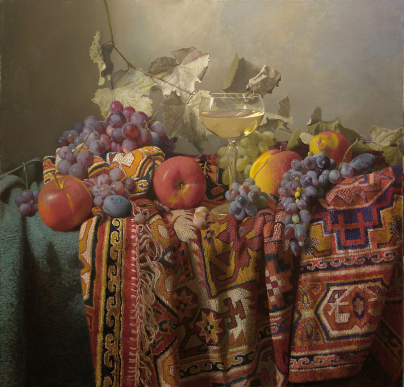 Теги: натюрморт с цветами, фрукты.