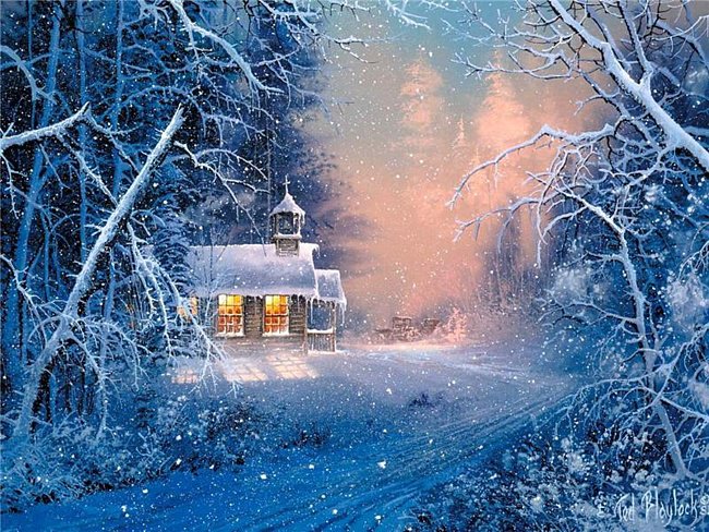 Теги: домик, снег, зима, река, тед хермит, дорога, лес, церковь.