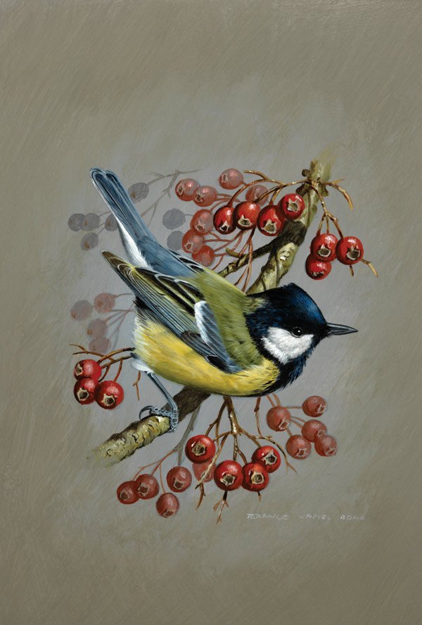 Теги: птицы, иллюстрации, синичка, пейзаж, ягоды, осень, природа.