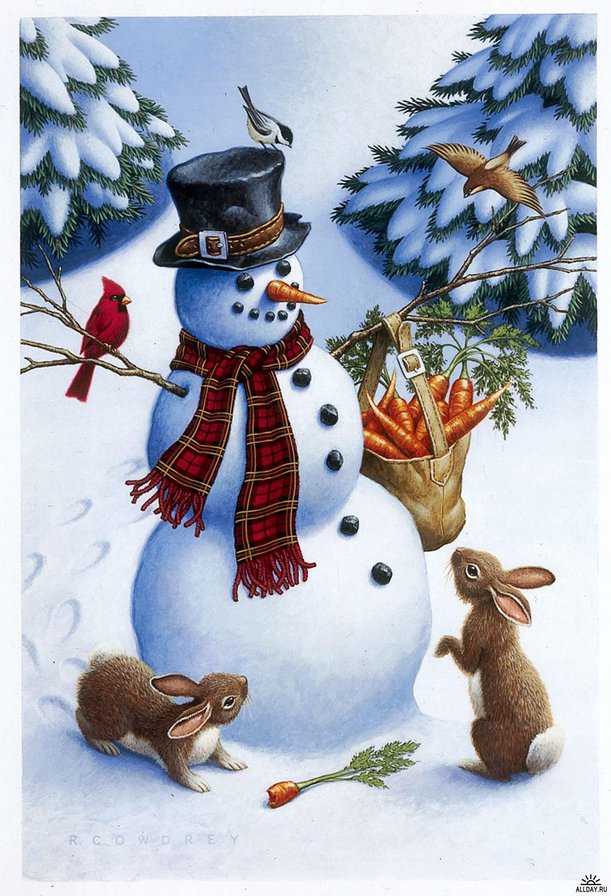 Теги: птицы.зима, детские, рождество.новый год, снег, снеговик, дерево, лес.