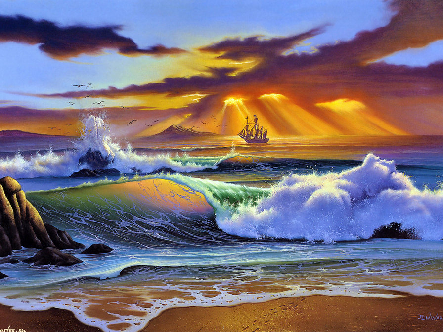 Теги: картина, волны, море, небо, дельфины, закат, пейзаж.