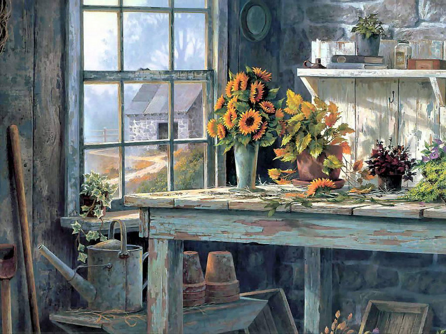 Теги: лето, украина пейзаж, подсолнух, двор, гуси, живопись, деревня.