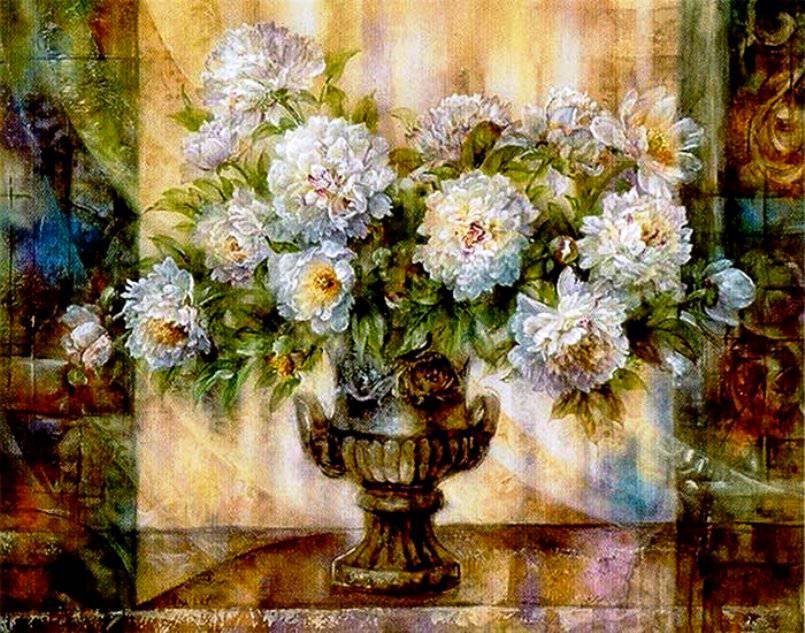 Теги: натюрморт, живопись, весна, пионы, букет, цветы, ваза.