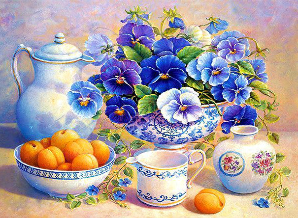 Схема вышивки «натюрморт с анютиными глазками и абрикосами» (№963199)
