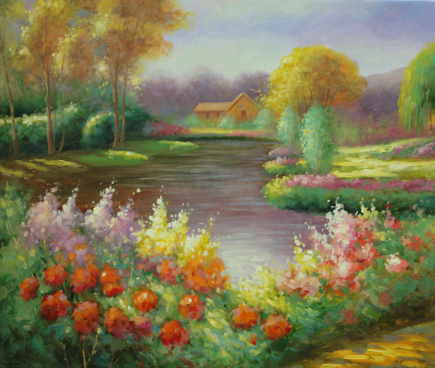Теги: дом, пейзаж, природа, пруд, окно, домик, цветы, лето.