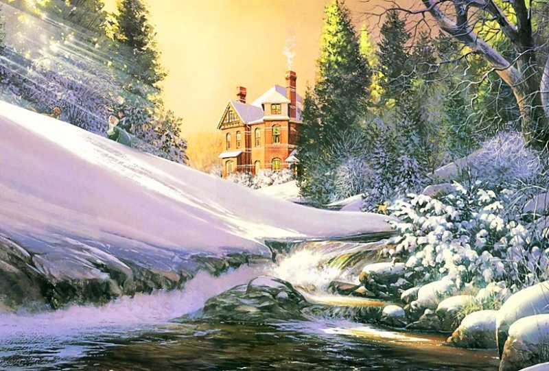 Теги: пейзаж, домик, зима, живопись, снег, мороз, деревня, природа.