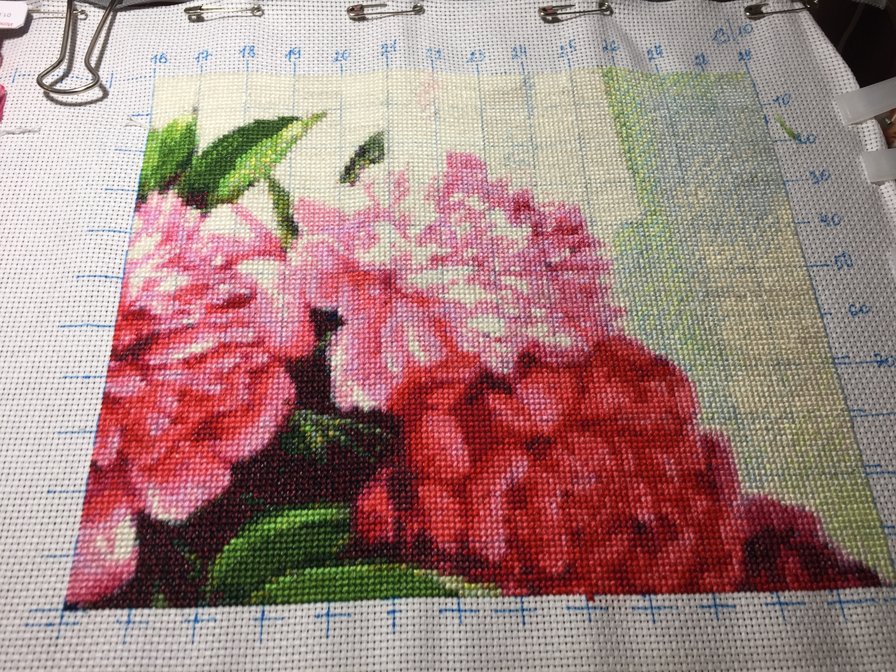 Этап процесса вышивки «Пионы»